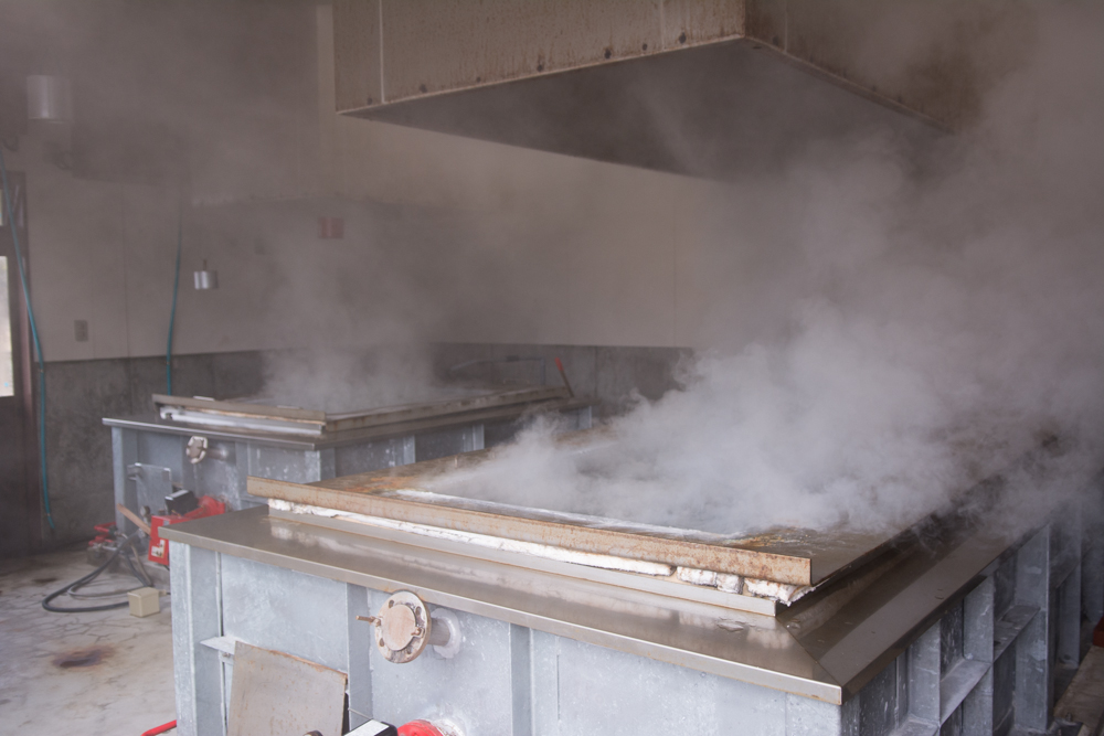 1. In the kettle on the left, the seawater is first boiled for 5 hours using a boiler. Then, it is transferred to the two neighboring kettles, where it simmers over a wood fire for another 12 hours.